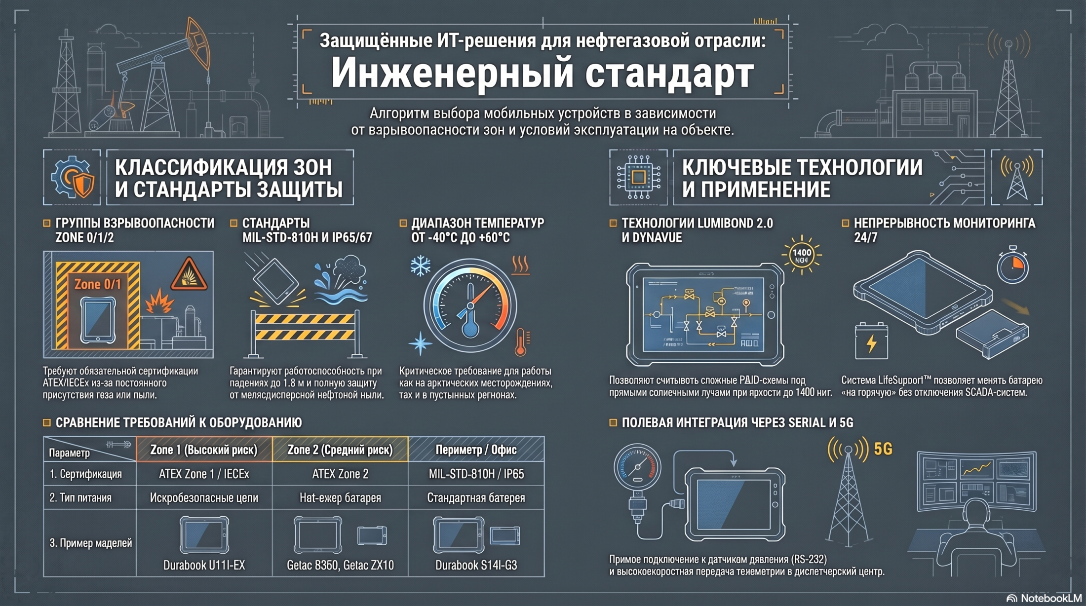 Нефтегазовая промышленность — одна из самых требовательных сред для мобильной электроники. Буровые установки, нефтеперерабатывающие заводы, магистральные трубопроводы и морские платформы предъявляют экстремальные требования к вычислительной технике: взрывозащита, работа при температурах от −40 °C до +60 °C, устойчивость к вибрации, агрессивным химикатам и полной темноте при аварийном освещении.