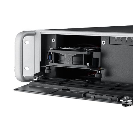 - Передний доступ к системному вентилятору — упрощает обслуживание без необходимости открывать верхнюю крышку корпуса.
