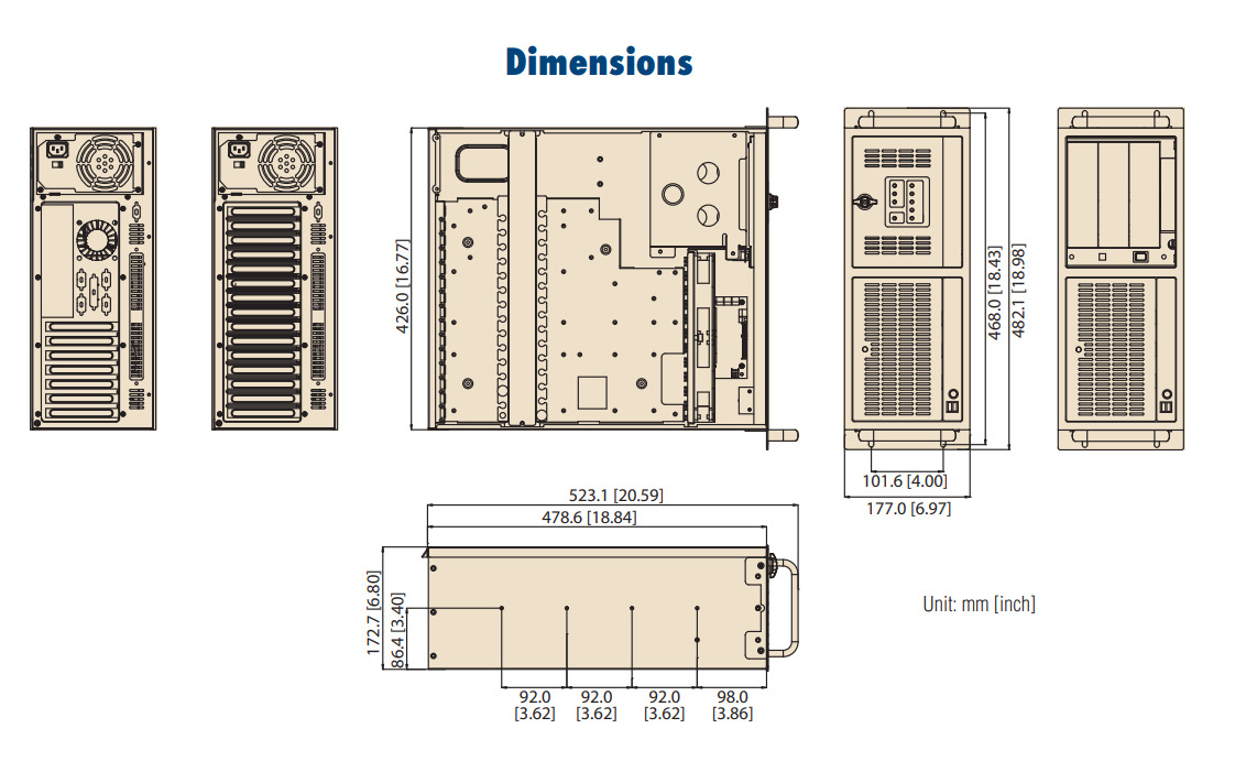 - Габаритные размеры: 482 мм в ширину, 479 мм в глубину и 177 мм в высоту, что соответствует стандарту 4U для монтажа в 19-дюймовую стойку.