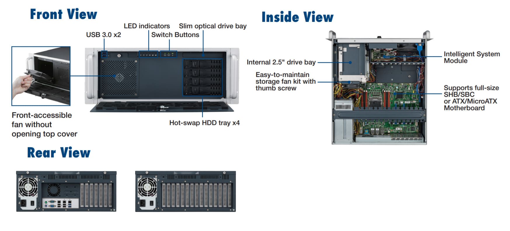 Одной из ключевых особенностей ACP-4340MB-50RB является поддержка до 14 слотов расширения, что позволяет интегрировать различные карты расширения и модули, соответствующие потребностям вашего проекта. Корпус оснащен ударопрочным отсеком для горячей замены, вмещающим четыре лотка для дисков 3.5" и 2.5" SATA, один тонкий оптический дисковод и один внутренний диск 2.5". Это обеспечивает гибкость в выборе и установке накопителей, а также упрощает процесс обслуживания и замены компонентов без прерывания работы системы.