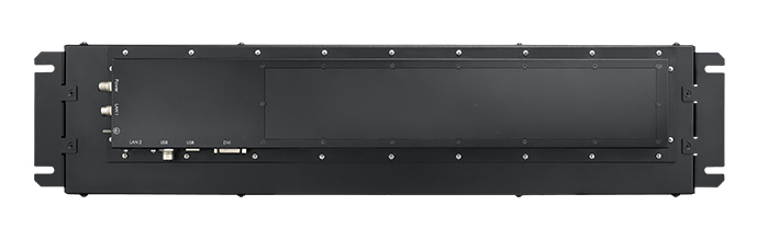 Устройство оснащено двумя портами USB 2.0 для подключения периферийных устройств и одним сетевым интерфейсом Ethernet (10/100/1000 Мбит/с) с разъемом M12, обеспечивающим надежное соединение в условиях повышенной вибрации и воздействия внешних факторов. Видеоинтерфейс DVI-D позволяет подключать дополнительные мониторы или системы отображения. Питание осуществляется от источника постоянного тока 72 В через разъем M12, что делает устройство совместимым с различными транспортными системами.