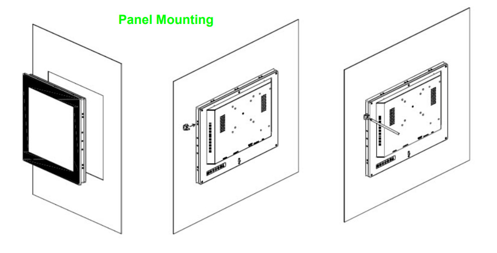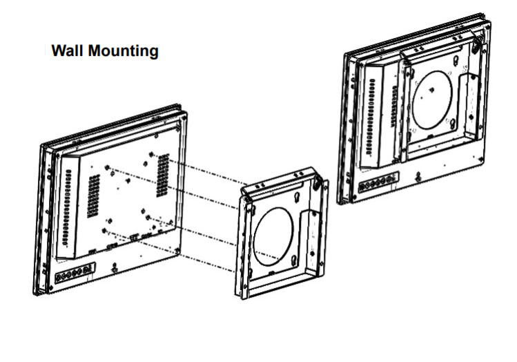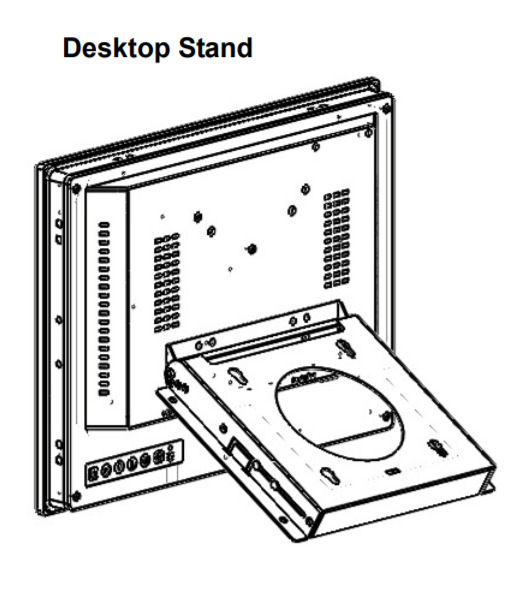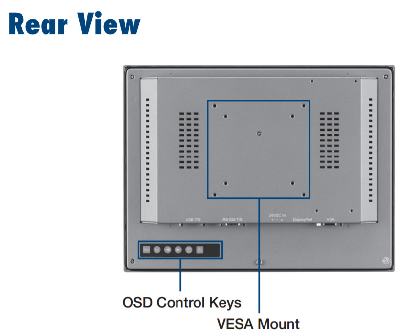 Монитор поддерживает различные варианты монтажа: настольный, настенный, встраиваемый в панель и с использованием VESA-креплений 75x75 и 100x100 мм, что обеспечивает гибкость при установке в различных производственных и промышленных средах. Входное напряжение питания составляет 24 В DC, что соответствует стандартам промышленного оборудования. Дополнительные функции включают кнопки управления OSD-меню на задней панели и запираемые разъемы ввода/вывода для повышения безопасности эксплуатации.