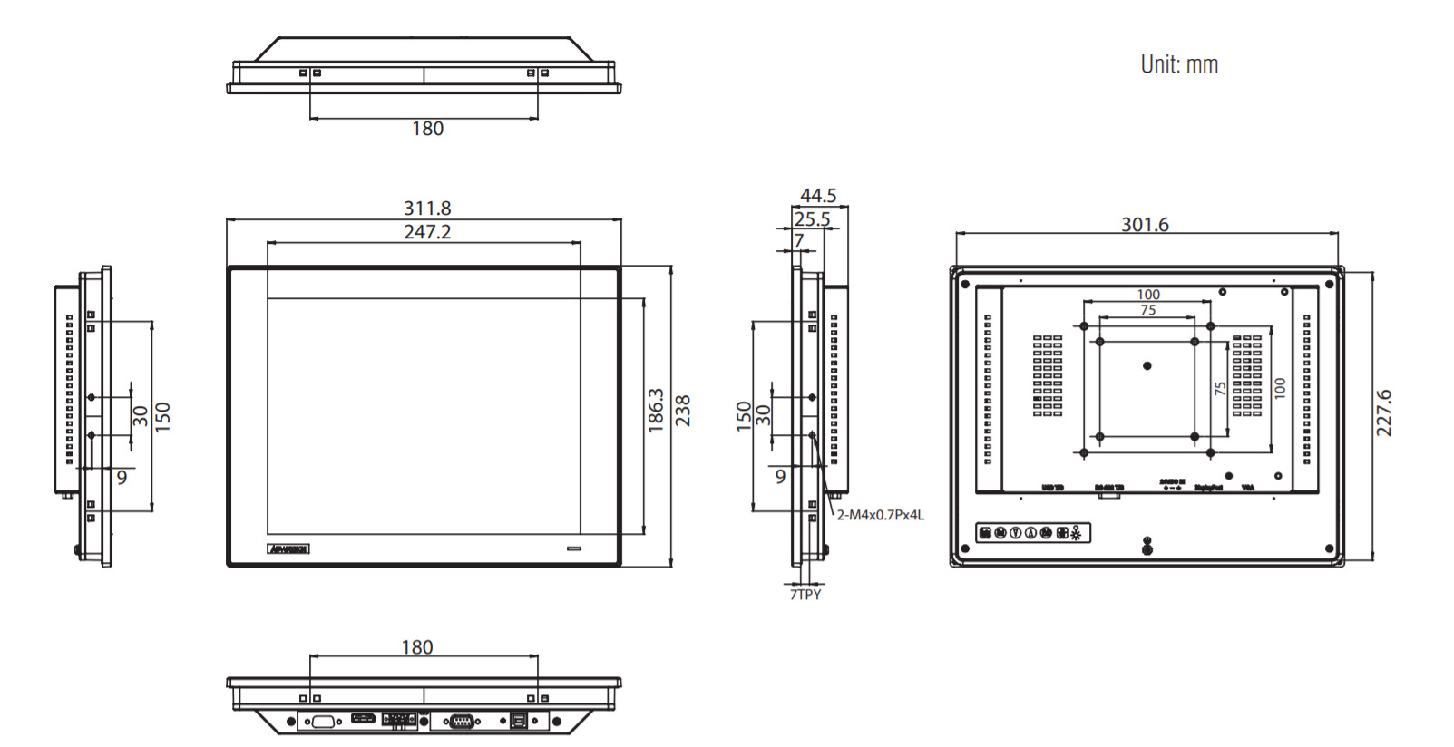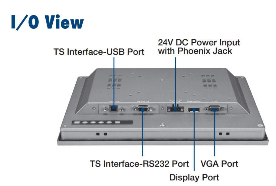Дисплей оснащен светодиодной подсветкой с яркостью 600 кд/м² и контрастностью 700:1, обеспечивая четкое изображение при различных условиях освещенности. Углы обзора составляют 160° по горизонтали и 140° по вертикали, что позволяет комфортно работать с экрана под разными углами. Сенсорный экран с 5-проводной резистивной технологией обеспечивает точное и надежное взаимодействие с пользователем. Интерфейсы подключения включают VGA и DisplayPort, а также комбинированный интерфейс RS-232 и USB для сенсорного управления.