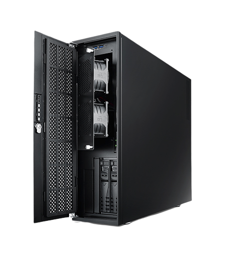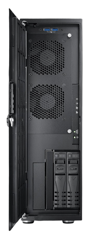 - Удобство обслуживания: фронтальный доступ к системному вентилятору без необходимости открывать верхнюю крышку корпуса, упрощая процесс технического обслуживания.