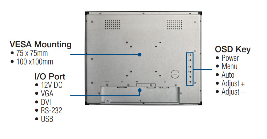 - Совместимость с различными интерфейсами: Наличие VGA-входа и блока питания 12 В DC обеспечивает совместимость с широким спектром промышленных компьютеров и систем, упрощая интеграцию и расширяя возможности применения монитора.