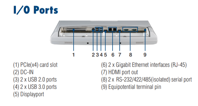 Интерфейсы ввода-вывода представлены двумя портами USB 2.0 и двумя USB 3.x, а также двумя COM-портами, поддерживающими стандарты RS-232/422/485. Для расширения функциональности доступны два слота Mini PCIe и один слот PCIe x4.