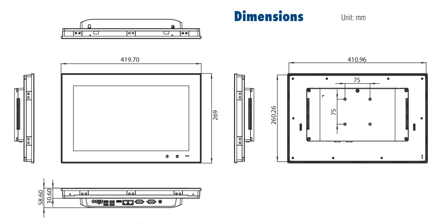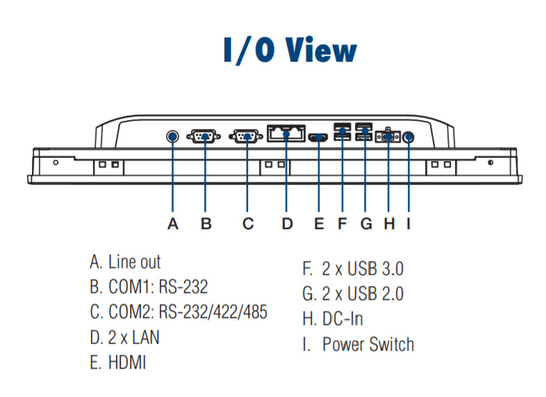 Сетевые возможности включают два порта Gigabit Ethernet (RJ-45), обеспечивающие высокоскоростное подключение к сети. Для подключения периферийных устройств предусмотрены четыре порта USB (два USB 2.0 и два USB 3.0), а также два последовательных порта RS-232 и RS-232/422/485, что расширяет возможности интеграции с различным промышленным оборудованием. Видеоинтерфейс HDMI позволяет подключать внешние дисплеи для расширения рабочего пространства.
