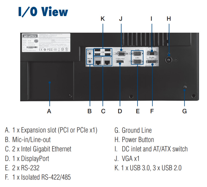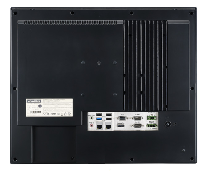 - Порты ввода/вывода: Четыре порта RS-232, один изолированный порт RS-422/485 с автоматическим управлением потоком, один USB 3.0, три USB 2.0, а также VGA и DisplayPort для подключения внешних дисплеев.