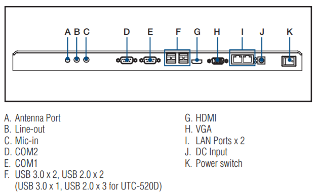 Для подключения периферийных устройств предусмотрены два порта USB 2.0 и два порта USB 3.x, обеспечивающие высокоскоростную передачу данных. Два порта RS-232 позволяют подключать различные промышленные устройства, такие как принтеры, сканеры штрих-кодов и другие периферийные устройства. Два порта Ethernet (RJ-45) с поддержкой 10/100/1000 Мбит/с обеспечивают надежное сетевое соединение для передачи данных и удаленного управления.