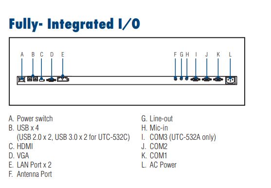 UTC-532FP-ATB0E оснащен широким набором интерфейсов для подключения периферийных устройств: