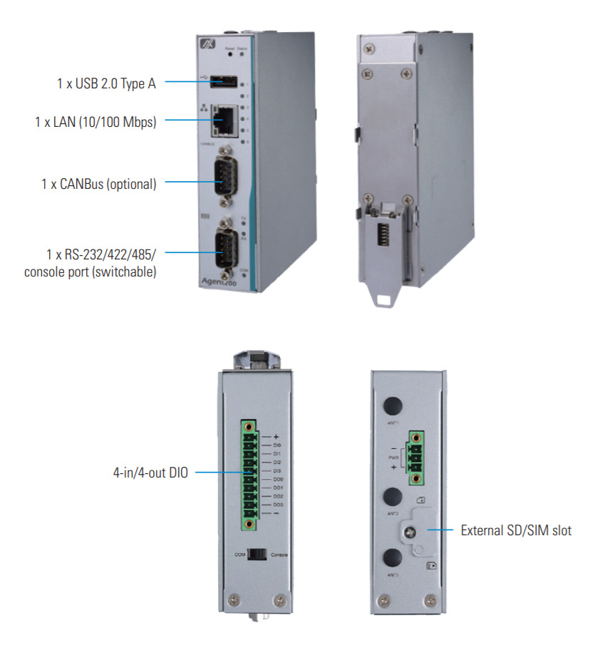 Устройство оснащено 4 входами и 4 выходами цифрового ввода-вывода (DIO), что позволяет эффективно взаимодействовать с внешними системами и датчиками. Для расширения функциональности предусмотрены два слота Mini PCI Express, поддерживающие модули Wi-Fi или 3G/4G, а также слот для SIM-карты, обеспечивая гибкость в выборе беспроводных технологий связи. Опциональный порт CANbus расширяет возможности интеграции с промышленными сетями и системами управления.