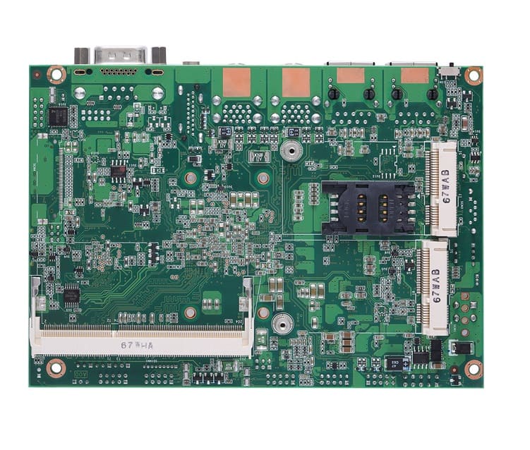 Плата оснащена слотом для SIM-карты и двумя слотами Mini PCIe, что позволяет интегрировать дополнительные модули, такие как Wi-Fi, Bluetooth или LTE, расширяя функциональность системы.