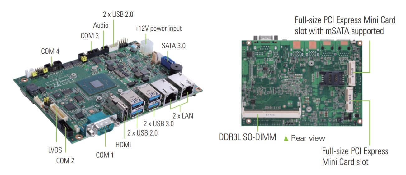 Видеовыходы HDMI и LVDS поддерживают подключение различных дисплеев, а опциональные интерфейсы VGA и eDP расширяют возможности визуализации.