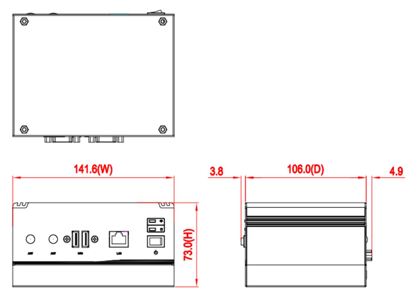 Компактные размеры (141,6 x 106 x 73 мм) и различные варианты монтажа — настольный, на DIN-рейку, VESA-крепление и настенный монтаж — позволяют интегрировать eBOX565-52R-FL-DC-8365UE в ограниченные пространства и различные монтажные схемы.