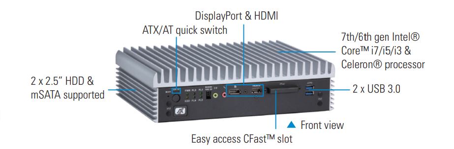 Устройство оснащено разъемом LGA1151, поддерживающим процессоры Intel Core i7/i5/i3 и Celeron 7-го и 6-го поколения, а также чипсетом Intel Q170. Максимальный объем поддерживаемой оперативной памяти составляет 32 ГБ DDR4-2133 SO-DIMM, что обеспечивает высокую производительность при обработке данных. Для хранения данных предусмотрены два отсека для 2,5-дюймовых жестких дисков SATA с поддержкой RAID 0/1, слот mSATA и слот CFast™, что позволяет гибко настраивать систему хранения в зависимости от требований пользователя.
