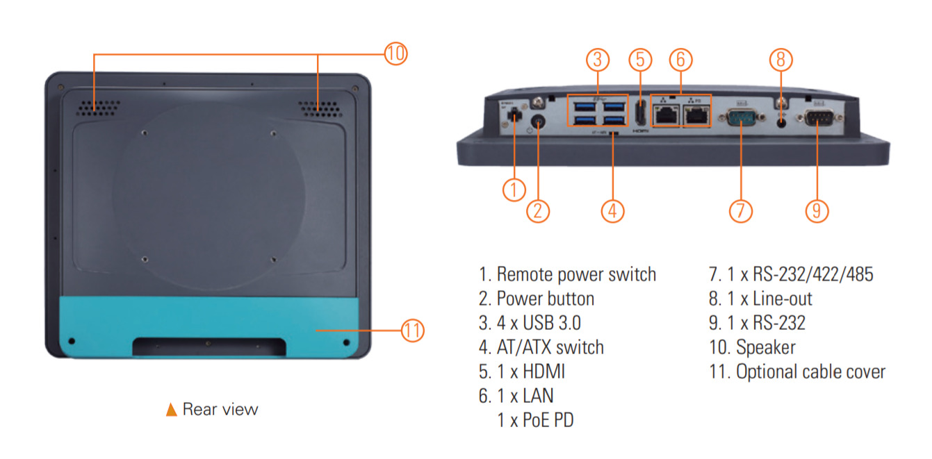 - Интерфейсы ввода/вывода: один порт RS-232, один порт RS-232/422/485, четыре порта USB 3.0 и HDMI, обеспечивающие широкие возможности подключения периферийных устройств.