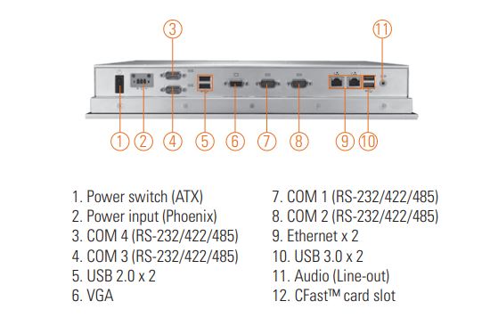 - Интерфейсы ввода/вывода: четыре порта COM (RS-232/422/485) и четыре порта USB (два USB 2.0 и два USB 3.x) для подключения различных периферийных устройств.