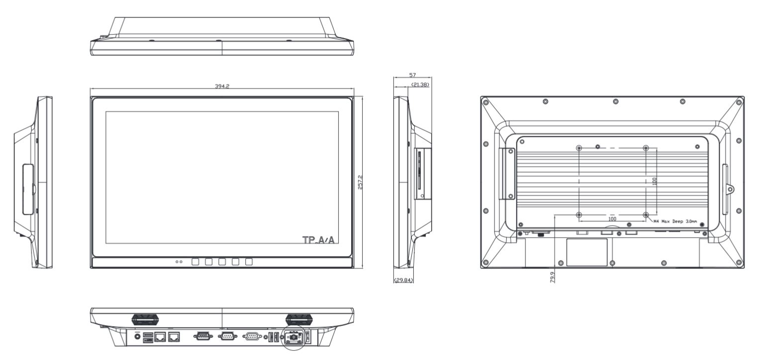 Корпус компьютера имеет защиту по передней панели IP65, что гарантирует его устойчивость к пыли и влаге, а пассивная система охлаждения исключает необходимость в вентиляторах, снижая уровень шума и повышая надёжность. Диапазон рабочих температур от 0 до +45°C позволяет использовать устройство в различных климатических условиях. Внешний адаптер питания с диапазоном входного напряжения 100–240 В AC обеспечивает гибкость в подключении к различным источникам питания.