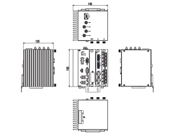 Устройство оснащено разнообразными интерфейсами: четыре порта USB 3.0, один COM-порт, цифровые входы/выходы (GPIO), а также видеоинтерфейсы HDMI и VGA. Для расширения функциональности предусмотрены два слота Mini PCIe и слот для SIM-карты, что позволяет интегрировать дополнительные модули и устройства.