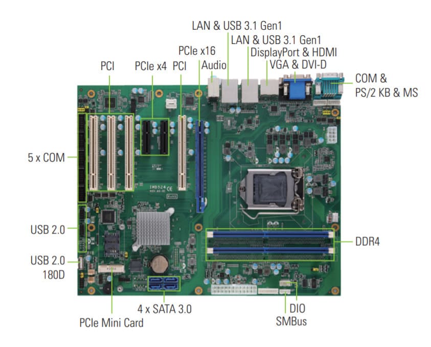 Плата оснащена одним слотом PCIe x16, двумя слотами PCIe x4, четырьмя слотами PCI и одним слотом Mini PCIe, что обеспечивает гибкость в расширении функциональности системы. Дополнительные функции включают программируемый сторожевой таймер, восстанавливающий систему в случае сбоев, и 8-канальный цифровой ввод-вывод (GPIO) для взаимодействия с внешними устройствами.