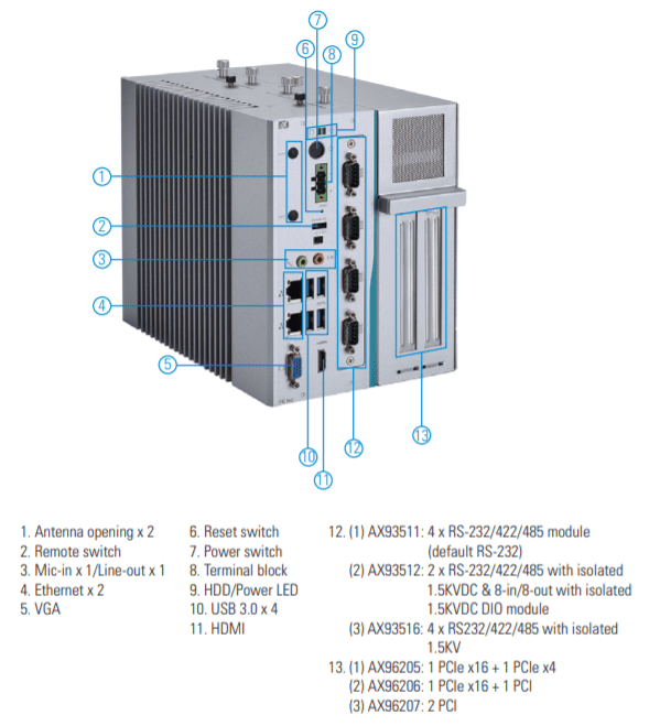 Возможности расширения системы включают один слот Mini PCIe для установки дополнительных модулей, таких как беспроводные адаптеры Wi-Fi, Bluetooth или LTE, а также различные модули ввода/вывода, включая порты RS-232/422/485 и цифровые входы/выходы. Это позволяет адаптировать систему под специфические требования различных приложений.