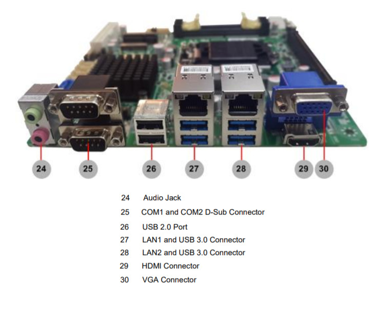 Сетевые возможности представлены двумя портами Gigabit Ethernet, обеспечивающими высокоскоростное подключение к сети. Для расширения функциональности доступны четыре порта USB 3.0, два порта USB 2.0, пять портов RS-232 и один порт RS-232/422/485, что делает плату подходящей для различных периферийных устройств. Дополнительные функции включают программируемый сторожевой таймер (WDT) с интервалом от 1 до 255 секунд и 16-разрядный цифровой ввод-вывод (GPIO), состоящий из 8 входов и 8 выходов, что расширяет возможности мониторинга и управления.