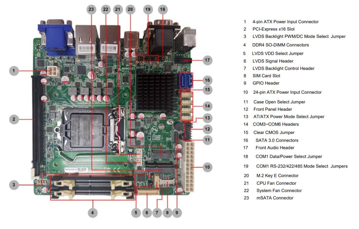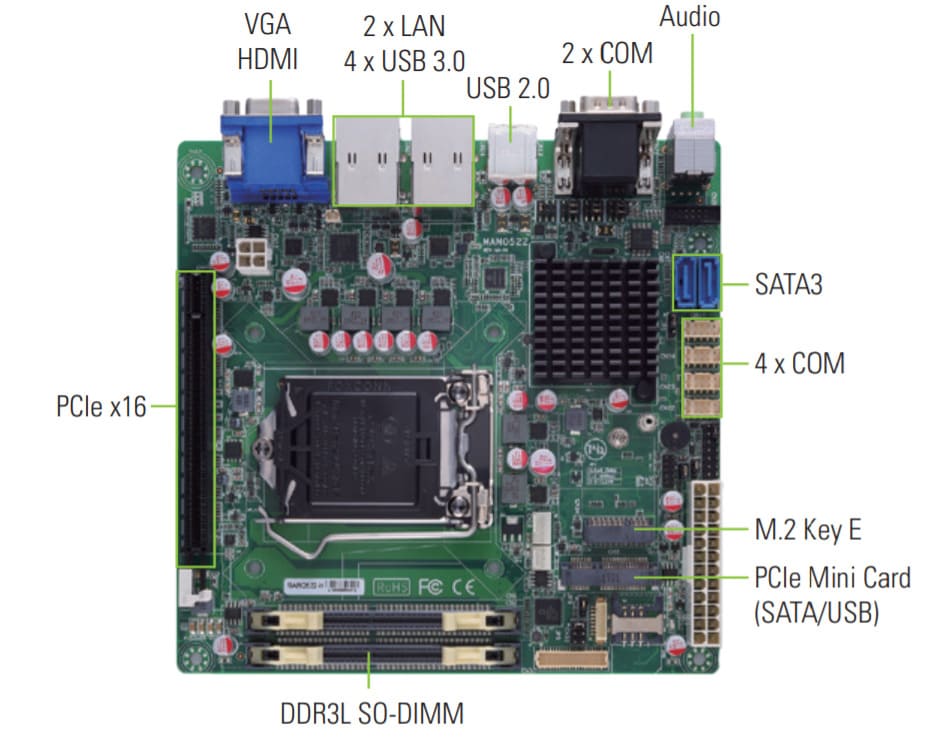 MANO522PHGGA-H310 идеально подходит для применения в системах автоматизации производства, киосках самообслуживания, информационно-развлекательных системах и цифровых вывесках, требующих компактного и надежного решения с возможностью расширения функциональности.