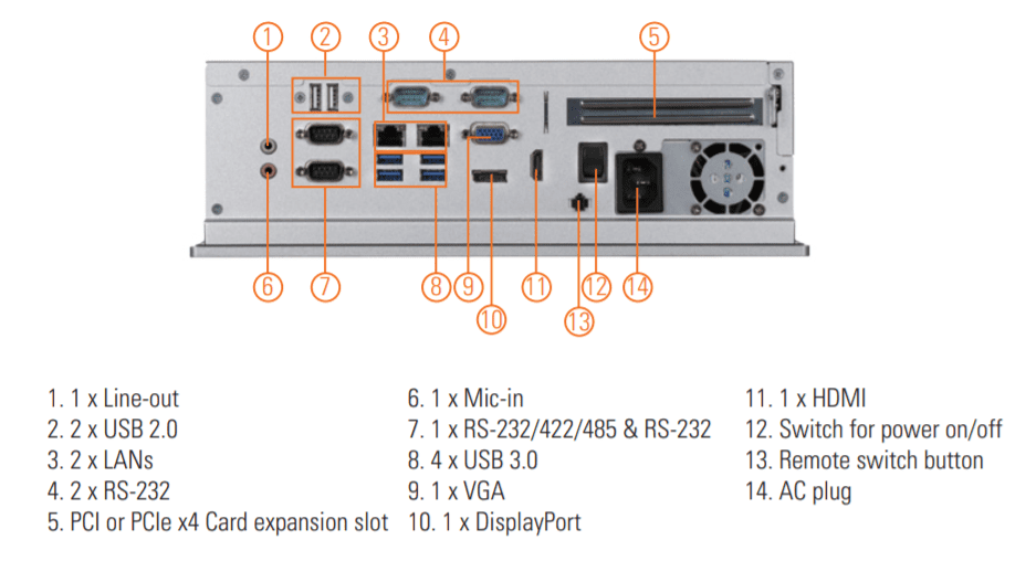 - Интерфейсы ввода/вывода: три порта RS-232, один порт RS-232/422/485, два порта USB 2.0 и четыре порта USB 3.0 для подключения периферийных устройств; два порта Gigabit Ethernet для надежной сетевой связи; аудиовыход и вход для микрофона для мультимедийных приложений.