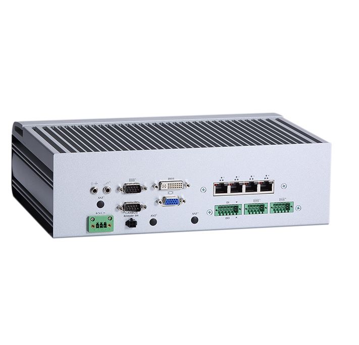 Сетевые возможности включают четыре порта Ethernet с разъемами M12, обеспечивающие надежное подключение в условиях транспортных средств. Для расширения функциональности предусмотрены три слота Mini PCIe, позволяющие интегрировать дополнительные модули, такие как беспроводные адаптеры Wi-Fi, LTE или Bluetooth. Интерфейсы ввода-вывода включают три COM-порта (RS-232/422/485), один порт CANbus и два порта цифрового ввода/вывода (DIO), что обеспечивает гибкость в подключении различных периферийных устройств.