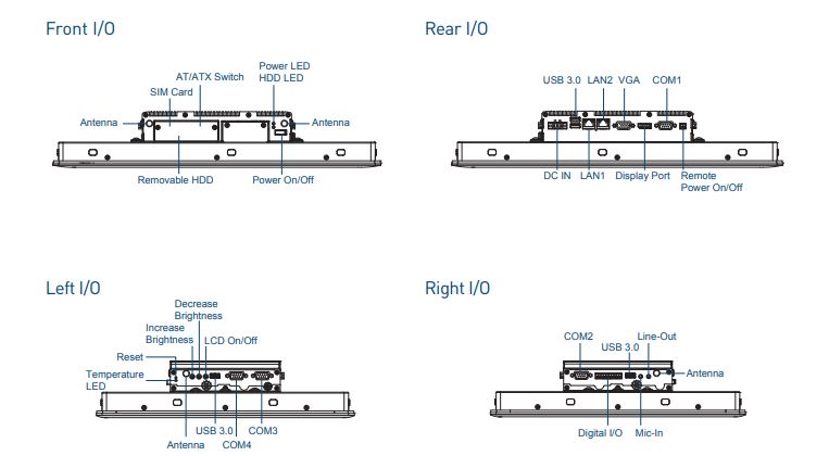 Сетевые возможности представлены четырьмя портами Ethernet 10/100/1000 (RJ-45) с поддержкой PoE, что упрощает подключение к сети и питание через Ethernet. Для периферийных устройств доступны четыре порта USB 3.x и четыре порта RS-232/422/485. Также имеются порты Digital I/O (GPIO), CFM и CDS для расширения функциональности.