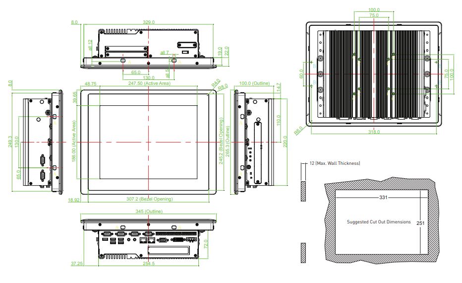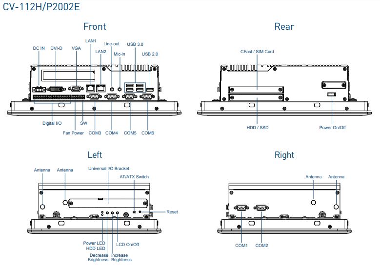 Панельный компьютер Cincoze CV-112HC/P2002E-i5 оснащён 12,1-дюймовым TFT XGA дисплеем с соотношением сторон 4:3 и проекционно-ёмкостным сенсорным экраном. Он оснащён процессором Intel Core i5-6300U 6-го поколения с тактовой частотой до 3,0 ГГц и поддерживает до 16 ГБ оперативной памяти DDR4. Устройство предлагает разнообразные интерфейсы: 5 портов USB 2.0, 6 последовательных портов RS-232/422/485, 4 порта Ethernet 10/100/1000 с поддержкой PoE, а также видеоинтерфейсы CDS, DVI-D и VGA. Для расширения функциональности предусмотрены слоты CFM PoE, CFM IGN, Mini PCIe и отсек Universal I/O. Панельный компьютер поддерживает различные операционные системы, включая Windows 7, Windows 8, Windows 10 и Linux. Он оснащён пассивной системой охлаждения, обеспечивая надёжную работу без вентиляторов. Устройство имеет класс защиты IP65 по передней панели, что гарантирует его устойчивость к пыли и влаге. В комплект входят динамики и сторожевой таймер, а также поддержка карт памяти Del и CFast. Возможности монтажа включают VESA-крепление и монтаж в панель. Устройство работает при температуре от -20°C до +70°C и поддерживает питание от 9 до 48 В DC. Сертификаты CE, FCC Class A и ТР ЕАЭС подтверждают соответствие устройства международным стандартам безопасности и электромагнитной совместимости.