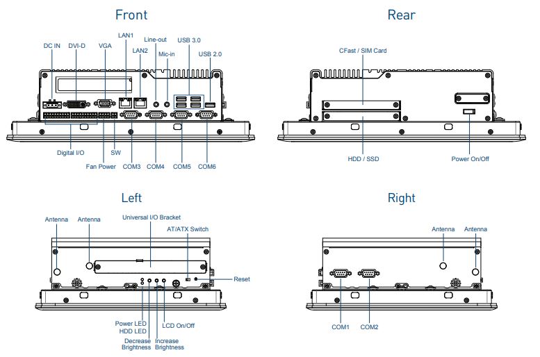 Преимущества модели включают пассивную систему охлаждения, отсутствие движущихся частей, что снижает вероятность механических повреждений и повышает надёжность. Возможность монтажа на VESA-крепление или в панель обеспечивает гибкость в установке. Совместимость с операционными системами Windows 7, 8, 10 и Linux расширяет возможности интеграции в различные программные среды.