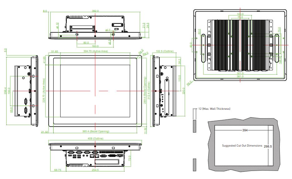 Корпус компьютера выполнен из алюминиевого сплава с классом защиты IP65 по передней панели, что обеспечивает защиту от пыли и влаги. Пассивная система охлаждения гарантирует бесшумную работу устройства. Панельный компьютер Cincoze CV-115C/P2002E-i5-PI поддерживает широкий диапазон входных напряжений от 9 до 48 В DC, что делает его совместимым с различными источниками питания в промышленной среде.