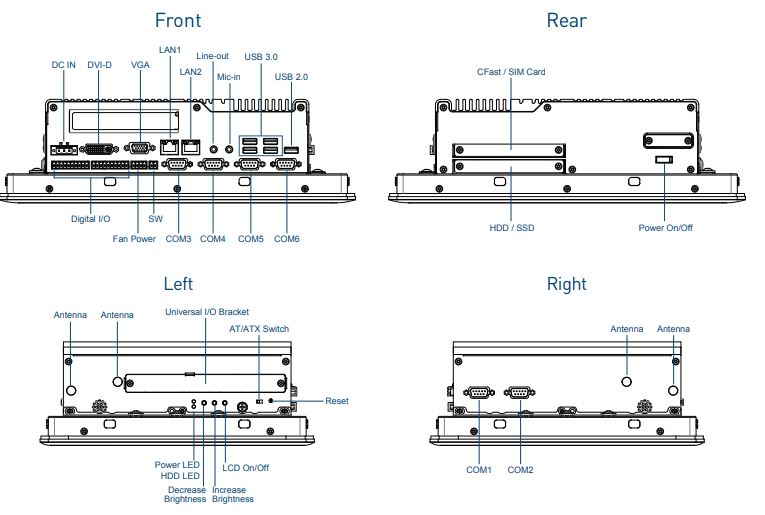 Устройство оснащено четырьмя портами Gigabit Ethernet с поддержкой PoE, что упрощает подключение к сети и питание периферийных устройств. Для подключения периферийных устройств предусмотрены пять портов USB 2.0, шесть последовательных портов RS-232/422/485 и 16 изолированных цифровых входов/выходов. Также имеются два полноразмерных слота Mini PCIe для расширения функциональности, включая добавление модулей беспроводной связи или дополнительных интерфейсов.