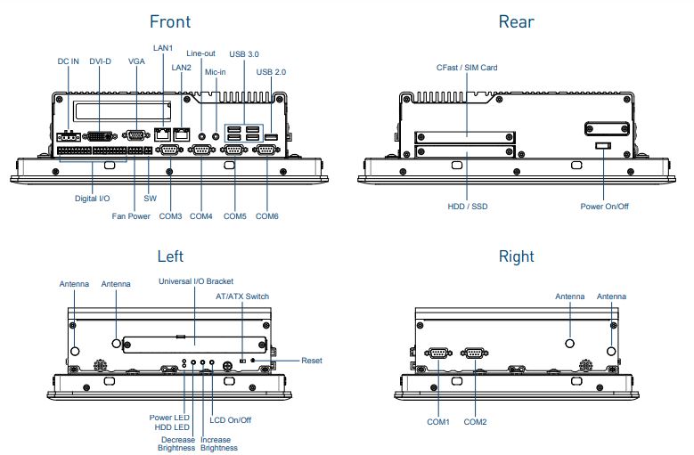 Устройство поддерживает до 32 ГБ оперативной памяти DDR4, что позволяет эффективно обрабатывать ресурсоёмкие задачи. Для хранения данных предусмотрены два отсека для 2,5-дюймовых SATA III жёстких дисков и один слот для CFast, обеспечивая гибкость в выборе носителей. Видеоподсистема интегрирована в процессор и поддерживает вывод изображения на три независимых дисплея через интерфейсы CDS, DVI-D и VGA, что расширяет возможности визуализации данных.