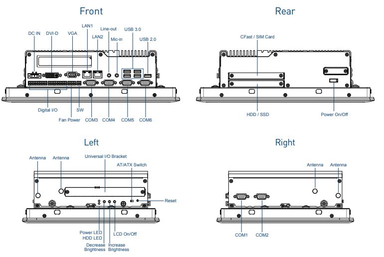 Компьютер поддерживает до 32 ГБ оперативной памяти DDR4, что позволяет эффективно обрабатывать ресурсоемкие задачи. Для хранения данных предусмотрены два отсека для 2,5-дюймовых накопителей SATA III с поддержкой RAID 0/1, а также слоты для CFast и SIM-карты, обеспечивая гибкость в выборе носителей.