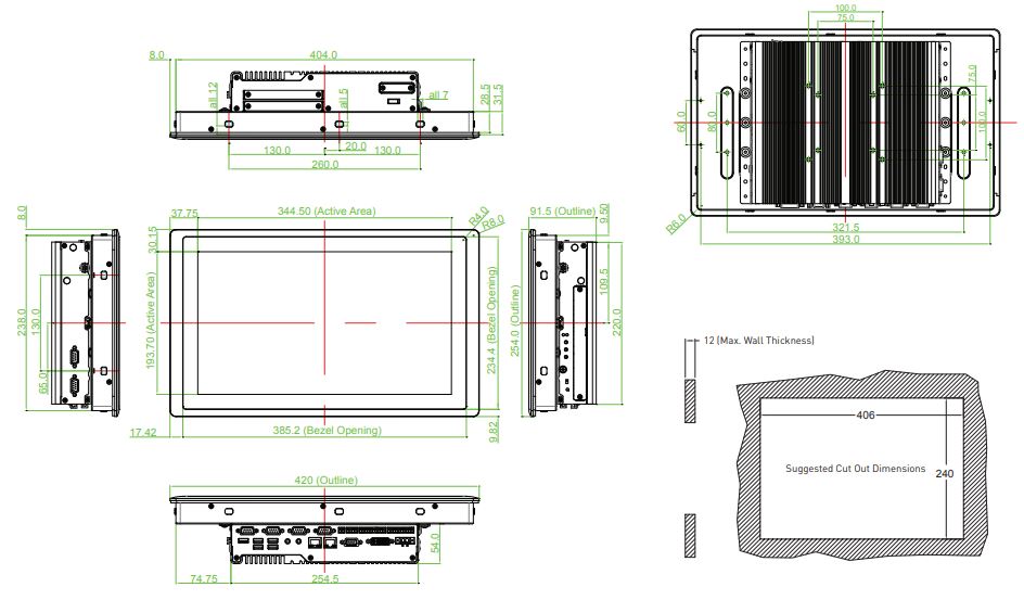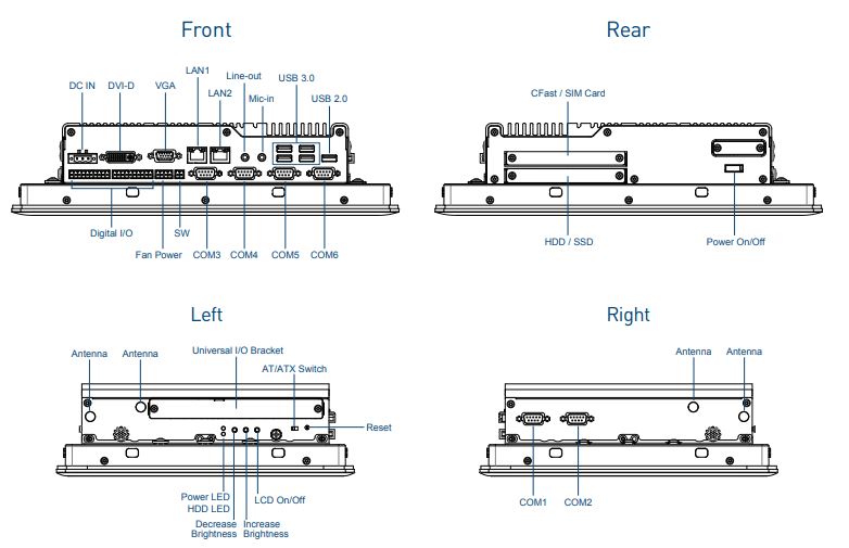 Класс защиты IP65 на передней панели гарантирует защиту от пыли и влаги, что делает компьютер пригодным для эксплуатации в сложных условиях. Пассивная система охлаждения обеспечивает бесшумную работу и повышает надёжность устройства. Дополнительные функции включают динамики, сторожевой таймер и поддержку технологии мгновенного перезагрузки, что повышает устойчивость системы к сбоям питания.