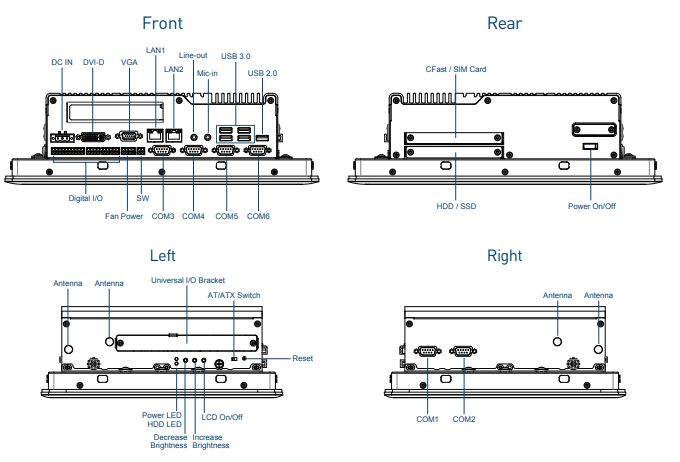 Класс защиты IP65 по передней панели гарантирует защиту от пыли и влаги, что делает устройство пригодным для эксплуатации в сложных промышленных условиях. Пассивная система охлаждения обеспечивает бесшумную работу и повышенную надёжность. Дополнительные функции включают динамики, сторожевой таймер и поддержку технологии мгновенного перезагрузки, что повышает надёжность системы в критических приложениях.