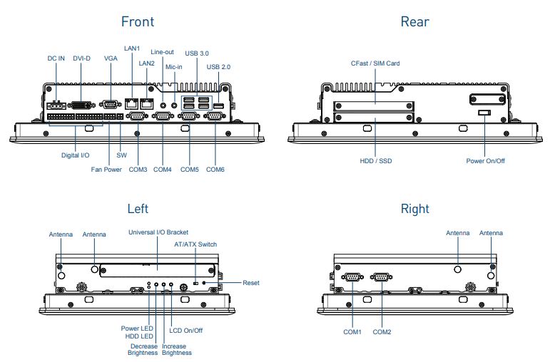 Оперативная память DDR4 поддерживает объём до 32 ГБ, обеспечивая быструю обработку данных. Для хранения данных предусмотрены два отсека для 2,5-дюймовых накопителей SATA III с поддержкой RAID 0/1, а также слоты для CFast и SIM-карты. Сетевые возможности включают четыре порта Gigabit Ethernet (RJ-45) с поддержкой PoE, что упрощает подключение к промышленным сетям и снижает количество необходимых кабелей.