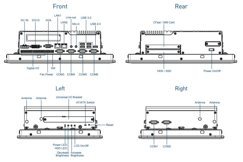 Устройство поддерживает до 64 ГБ оперативной памяти DDR4, что позволяет эффективно работать с ресурсоёмкими задачами. Для хранения данных предусмотрены два отсека для 2,5-дюймовых накопителей SATA III, поддерживающих RAID 0/1, а также слоты для CFast и SIM-карты, обеспечивая гибкость в выборе носителей.