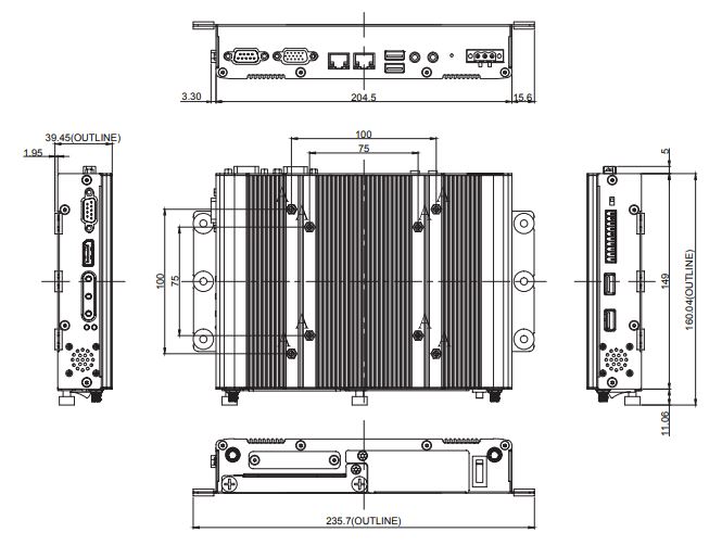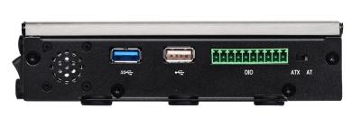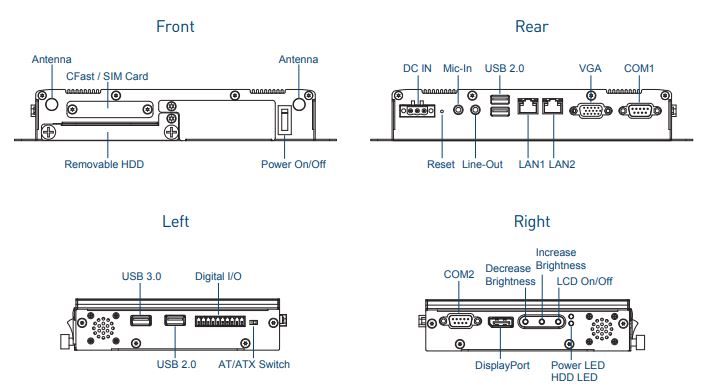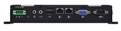Устройство поддерживает до 8 ГБ оперативной памяти DDR3L через слот SO-DIMM, что позволяет эффективно работать с ресурсоёмкими приложениями. Для отображения информации предусмотрены два видеовыхода: VGA и DisplayPort, поддерживающие подключение двух мониторов. Сетевые возможности включают два порта Gigabit Ethernet (LAN) для обеспечения стабильной передачи данных. Для подключения периферийных устройств доступны четыре порта USB (один USB 3.0 и три USB 2.0), два последовательных порта RS-232/422/485 и восемь цифровых входов/выходов (GPIO). Для расширения функциональности предусмотрены слоты Mini PCIe и SIM-карта.