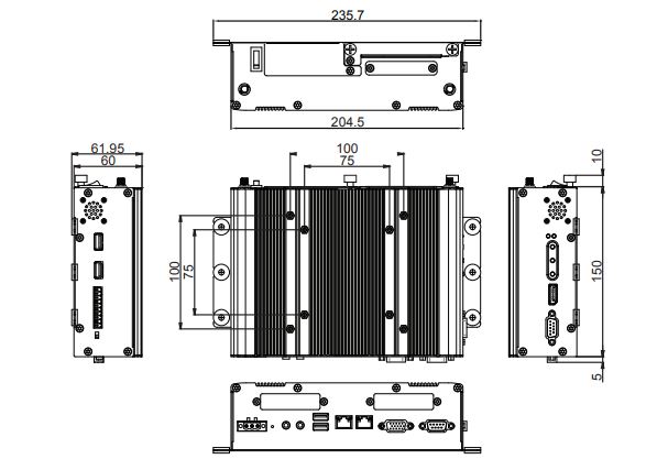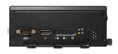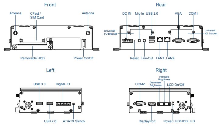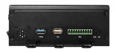Видеовыходы представлены разъёмами VGA и DisplayPort, поддерживающими разрешение до 1920x1080 при 60 Гц. Сетевые интерфейсы включают два порта Gigabit Ethernet (RJ-45) с поддержкой Wake-on-LAN, Teaming, Jumbo Frame и PXE. Для подключения периферийных устройств предусмотрены четыре порта USB (один USB 3.2 Gen1 и три USB 2.0), два COM-порта (RS-232/422/485) с автоуправлением потоком и восемь изолированных цифровых входов/выходов (4 входа и 4 выхода).