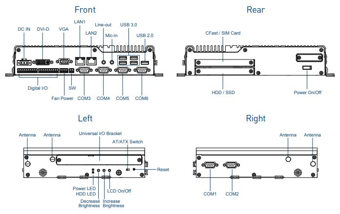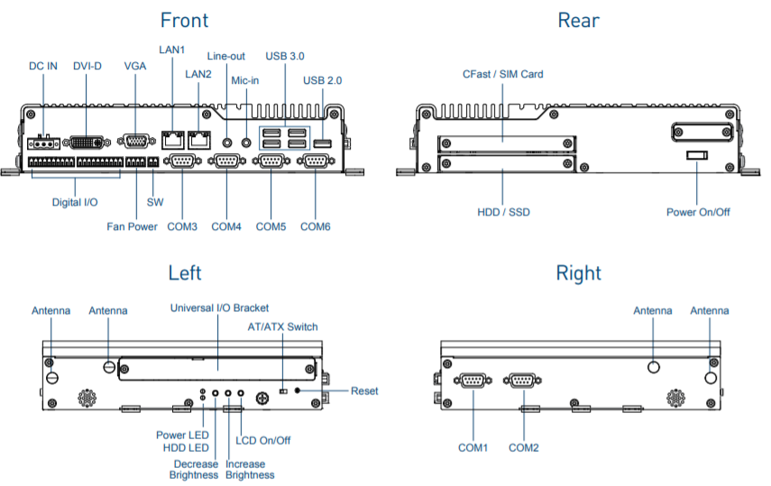 - Порты ввода/вывода: шесть COM-портов (RS-232/422/485), пять USB-портов (четыре USB 3.0 и один USB 2.0), цифровой вход/выход (GPIO).