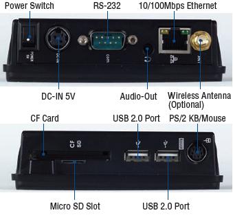 Устройство оснащено одним портом Ethernet 10/100 Мбит/с (RJ-45), двумя USB 2.0 портами, аудиовыходом и одним портом RS-232/422/485, что позволяет интегрировать его в различные промышленные системы. Питание осуществляется через внешний адаптер мощностью 20 Вт, поддерживающий входное напряжение 220 В AC. Система охлаждения пассивная, безвентиляторная, что повышает надёжность и снижает уровень шума.