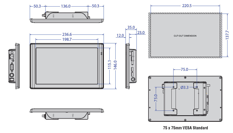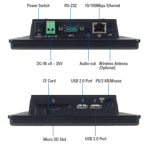 В основе устройства лежит процессор DM&P Vortex86MX+ с тактовой частотой 800 МГц, поддерживающий 512 МБ встроенной памяти DDR2. Для расширения памяти предусмотрены слоты для CompactFlash и MicroSD карт. Панельный компьютер оснащён одним портом LAN (RJ-45), двумя USB 2.0 портами, а также последовательными портами RS-232/422/485, что обеспечивает гибкость подключения различных периферийных устройств.