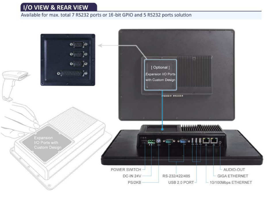Сетевые возможности включают один порт 10/100 Мбит Ethernet и опциональный порт Gigabit Ethernet, что позволяет интегрировать устройство в различные сетевые инфраструктуры. Для подключения периферийных устройств предусмотрены три порта USB 2.0, два порта RS-232/422/485, разъём PS/2 для клавиатуры и аудиовыход. Опционально доступен модуль WLAN для беспроводной связи.