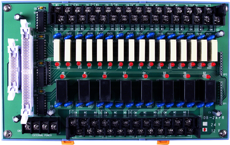 Плата DB-24PR/12/DIN CR от компании ICP DAS представляет собой 24-канальную выносную плату силовых реле с рабочим напряжением 12 В, предназначенную для эффективного управления различными электрическими нагрузками в промышленных системах автоматизации. Устройство оснащено 8 реле с перекидными контактами (Form C) и 16 реле с нормально разомкнутыми контактами (Form A), что обеспечивает гибкость в подключении и управлении различными типами цепей.