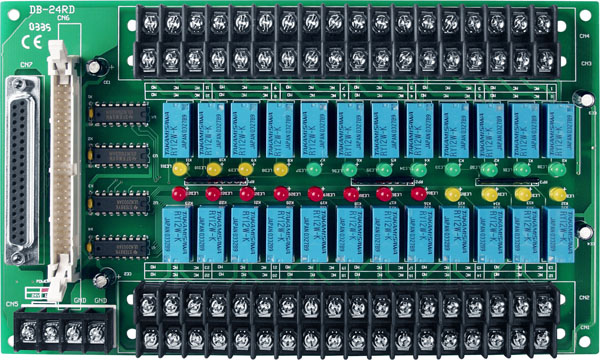Плата DB-24RD/12 CR от компании ICP DAS представляет собой 24-канальную плату электромеханических реле с разъемом DB-37, предназначенную для управления различными устройствами в промышленных системах автоматизации. Каждый канал оснащен реле с перекидными контактами (Form C), что обеспечивает гибкость в подключении и управлении различными типами нагрузок.