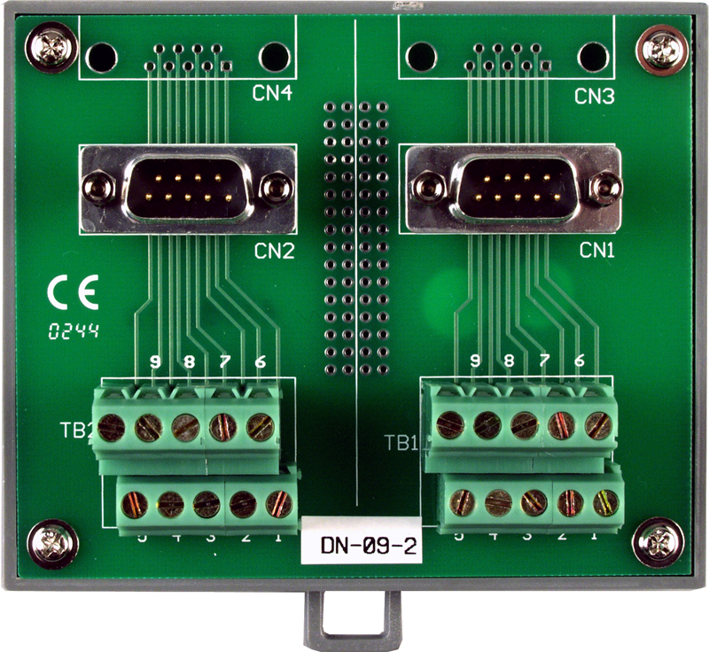 Плата DN-09-2 от компании ICP DAS представляет собой клеммный блок, предназначенный для удобного подключения периферийных устройств с интерфейсом RS-232. Устройство оснащено двумя 9-контактными разъемами D-sub типа "папа" (DB9 male) и винтовыми клеммами для прямого подключения проводов, что обеспечивает надежное и безопасное соединение.