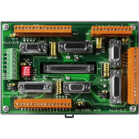 Плата DN-8368UB CR от компании ICP DAS представляет собой универсальную оптоизолированную терминальную плату, предназначенную для подключения и управления 3 осями шаговых или серводвигателей. Она служит расширением для 6-осевых контроллеров движения ICP DAS, таких как PISO-PS600 и PISO-VS600, обеспечивая удобное подключение и защиту управляющих сигналов.
